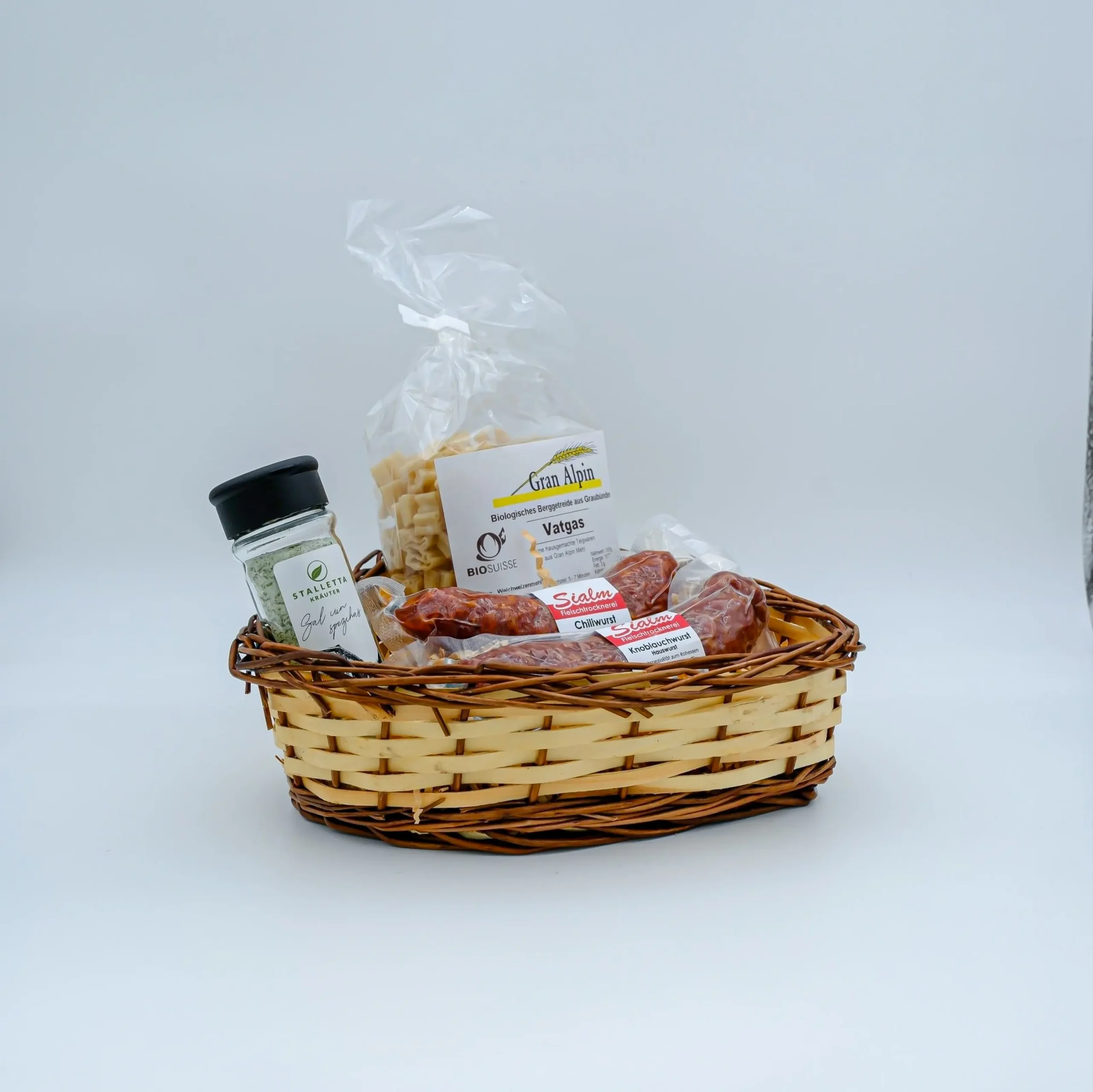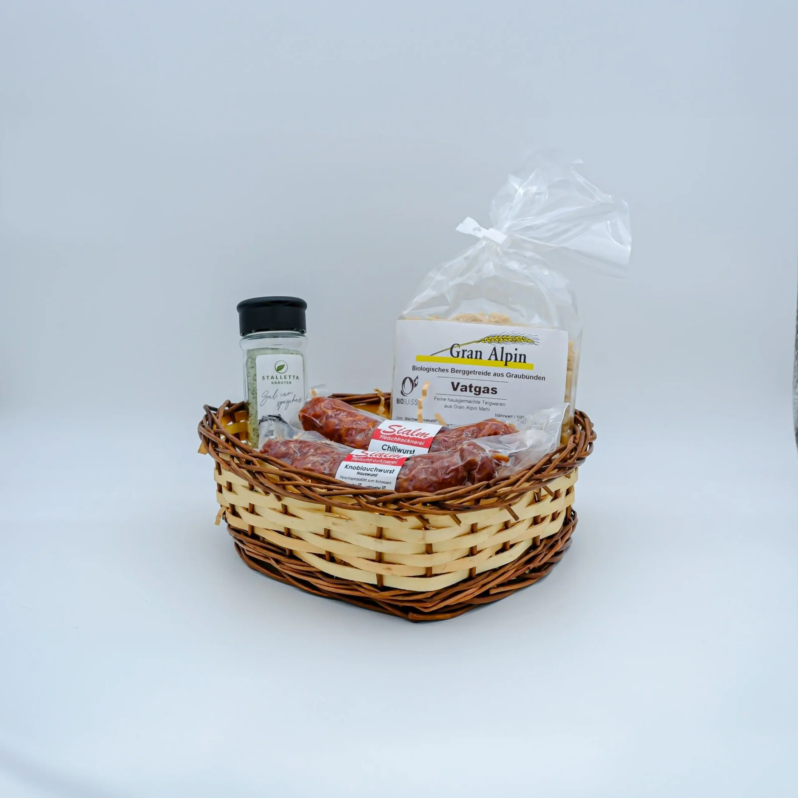 Echte Bündner Genussmomente mit kräftigen Aromen und würzigen Spezialitäten. Von mild-aromatisch bis pikant bringt unser Geschenkkorb “Piz Corvatsch” eine schöne Vielfalt auf den Tisch: Das feine Kräutersalz verleiht jedem Gericht eine alpine Note, die Chiliwurst sorgt für den feurigen Kick, während die Knoblauchwurst herzhafte Bündner Tradition pur verkörpert. Abgerundet wird das Set durch Vatgas Teigwaren in Kuhform – ein Highlight für Gross und Klein, perfekt für eine bodenständige, aber besondere Mahlzeit.
