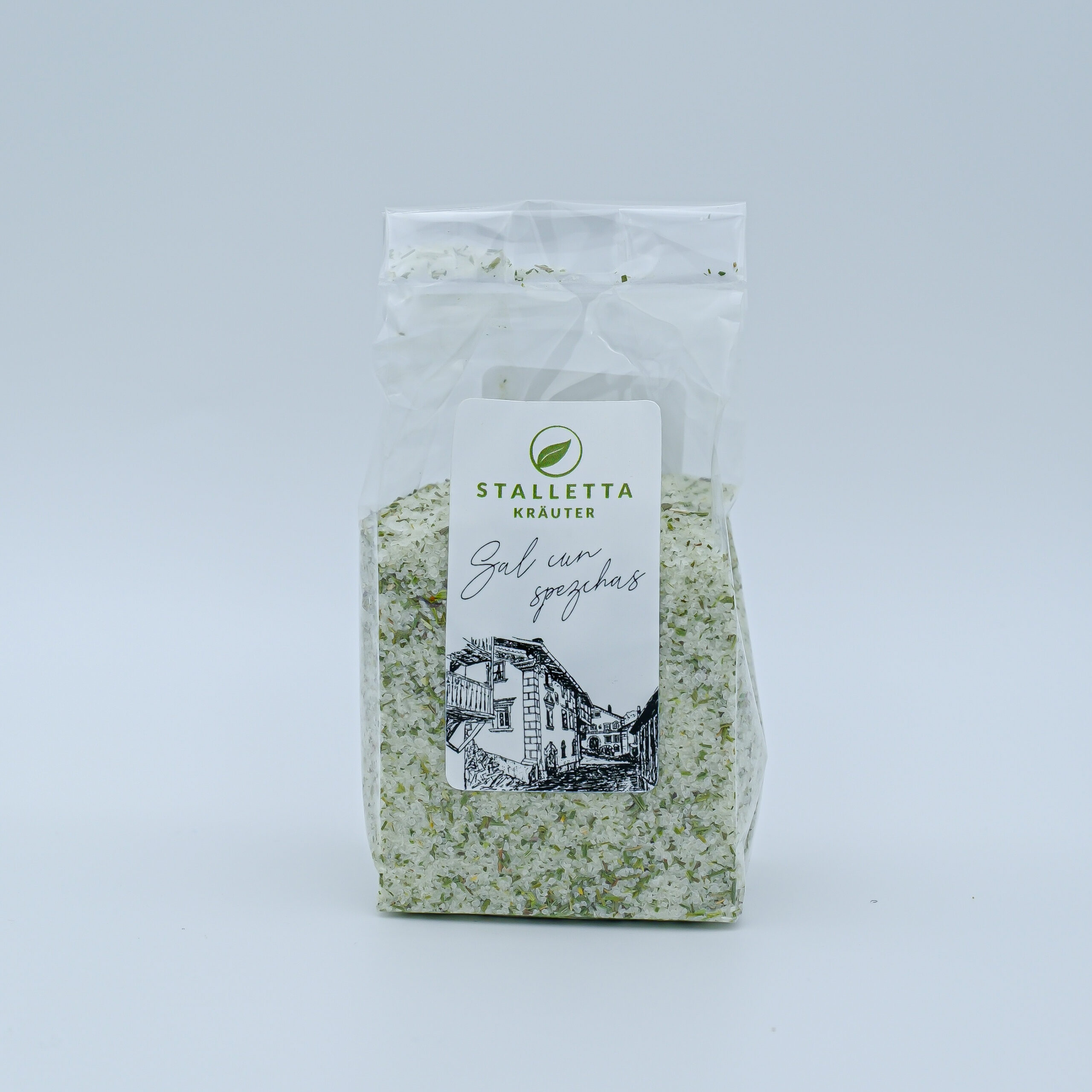 Praktisch: Unser Bündner Kräutersalz gibt es auch im umweltfreundlichen Nachfüllpack. Die Mischung aus feinem Meersalz und aromatischen Kräutern – Schnittlauch, Petersilie, Oregano, Bohnenkraut, Salbei, Thymian, Rosmarin, Estragon, Majoran und Dill – stammt aus dem Bio-Suisse-zertifizierten Kräutergarten in Ftan. Schonend geerntet und verarbeitet bringt es mediterrane Düfte und Engadiner Natürlichkeit in deine Küche. Ideal zum Auffüllen deines Stalletta-Glases oder für den direkten Gebrauch.