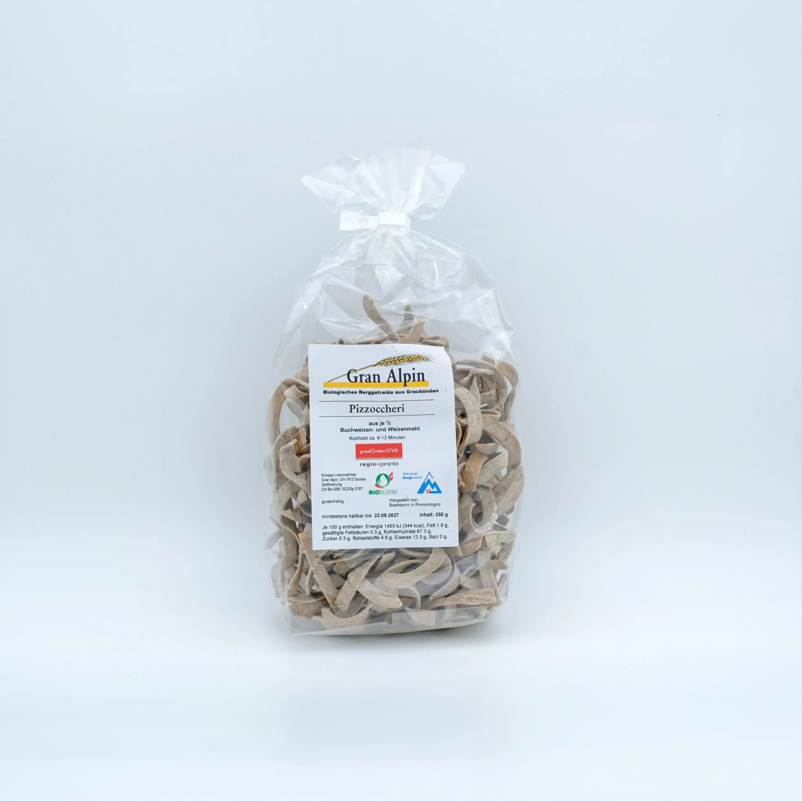 Tradition trifft Geschmack: Unsere originalen Pizzoccheri ursprünglich aus dem Süden Graubündens bringen herzhaften Alpengeschmack direkt auf deinen Teller. Die dunkle Buchweizennudel überzeugt durch ihre rustikale Note und passt perfekt zu deftigen Gerichten mit Wirz, Kartoffeln, Knoblauch und Käse.