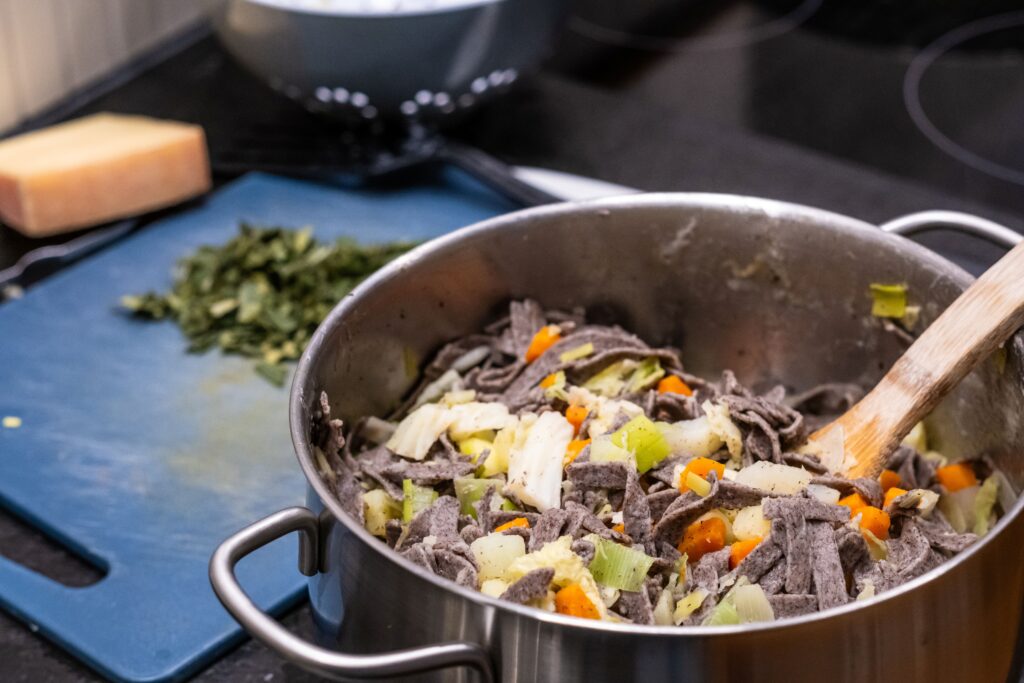 1. Teigwaren (Pizzoccheri) 8-12 Min. im Salzwasser gar kochen (können je nach Platz auch mit dem Gemüse gekocht werden).